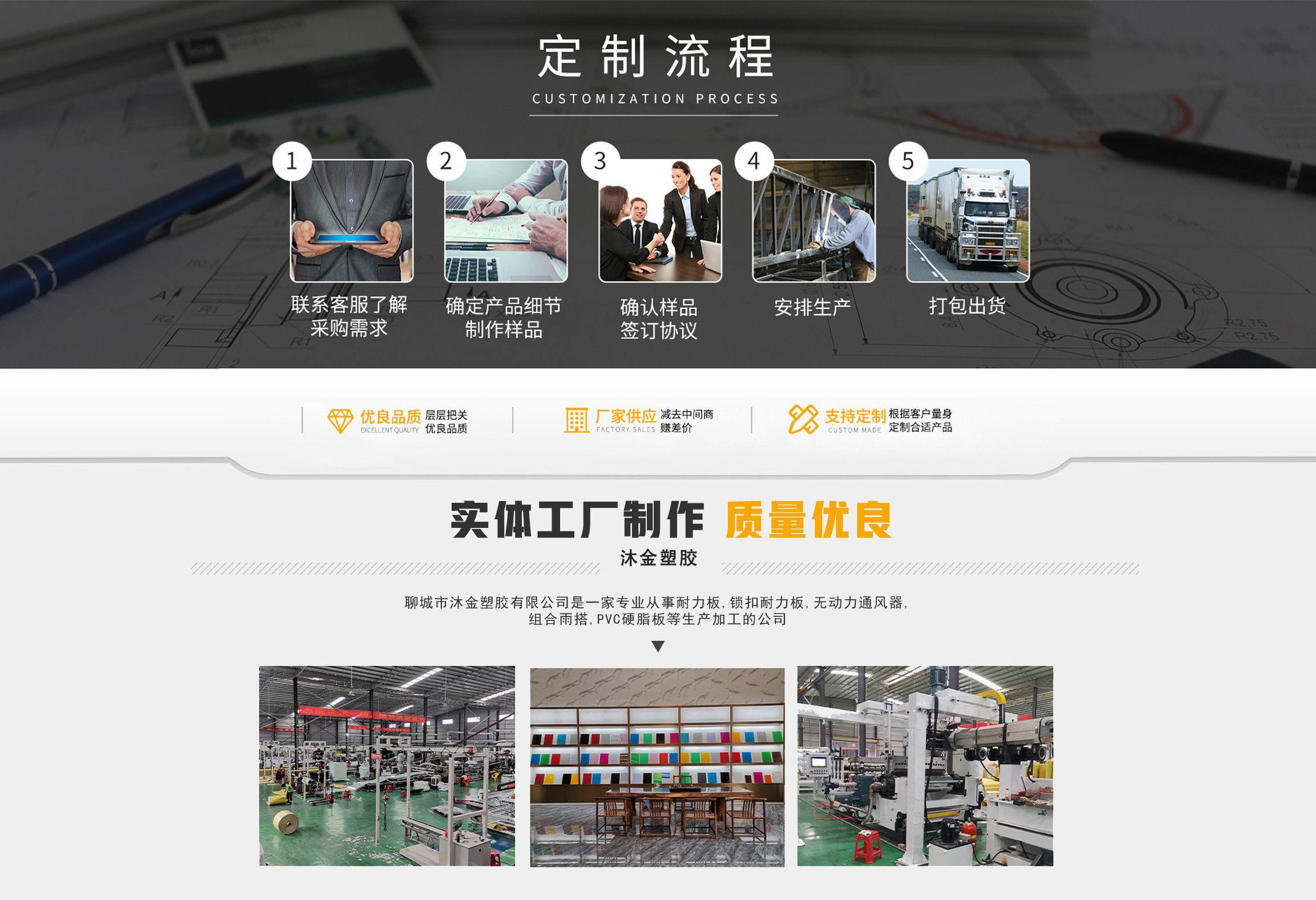 聊城市沐金塑膠有限公司注冊資金2180萬元,占地20000余平方,擁有自建廠房15000平方,員工100余名。10余年來,公司主營耐力板,鎖扣耐力板,耐力板深加工,無動力通風器,組合雨搭,PVC硬脂板,耐力板廠家等板材的發展戰略,逐漸成長為綜合性企業。  公司擁有多條板材共擠生產線,采用世界知名品牌進口原材料和先進工藝,依據完善的ISO9001質量管理體系和ISO14001環境管理體系,為產品的卓越品質提供了強有力的保證。憑借過硬的創新能力和堅實的硬件基礎,贏創已成為國內領先的熱塑性板材生產商,產品被廣泛應用于建筑業、農業、工業、廣告業、安防行業及DIY領域。  公司始終致力于通過提供最優的板材應用解決方案,為客戶創造最高的價值;堅守創新、質量、靈活、服務和速度的核心價值觀;堅持“完美的產品需要完美服務的支持”的經營理念,努力實現成為世界領先的板材與解決方案供應商的夢想。  在未來,公司將立足客戶需求,不斷改變和完善現有產品,拓展產品線和充分開發板材的應用領域,為客戶創造全方位的價值。同時更好地實現員工的價值,實現公司團隊的價值。我們將與您一起創贏未來!  企業使命:成為世界領先的板材與解決方案供應商。  公司愿景:通過提供最優的板材應用解決方案,為客戶創造最高的價值。  核心價值觀:質量...